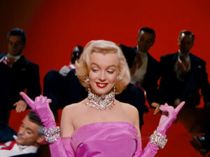 Jedna z najsłynniejszych filmowych sukienek – różowa kreacja Marilyn Monroe z komedii „Mężczyźni wolą blondynki” (1953). Została zaprojektowana przez Williama Travillę. MM wykonuje w niej piosenkę „Diamenty są najlepszym przyjacielem kobiety”, tańcząc na schodach z wianuszkiem mężczyzn. Do tej sceny nawiązała później Madonna w teledysku do piosenki „Material Girl” z 1980 roku. Ciekawostką jest fakt, że początkowo Marilyn miała wystąpić w zupełnie innej sukni, jednak stylizacja została ocenzurowana jako zbyt seksowna, dlatego Travilla miał bardzo mało czasu na przygotowanie innego stroju.